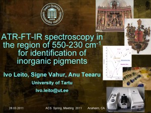 On 28.03.2011 Ivo Leito gave talk “ATR-FT-IR spectroscopy in the region of 550-230 cm-1 for identification of inorganic pigments” at the the 241th ACS National Meeting, Spring 2011 in Anaheim (CA).